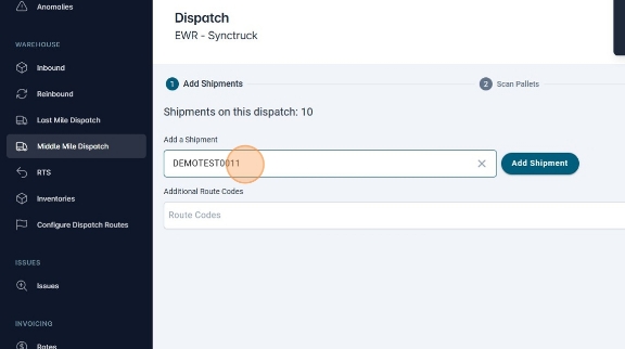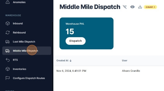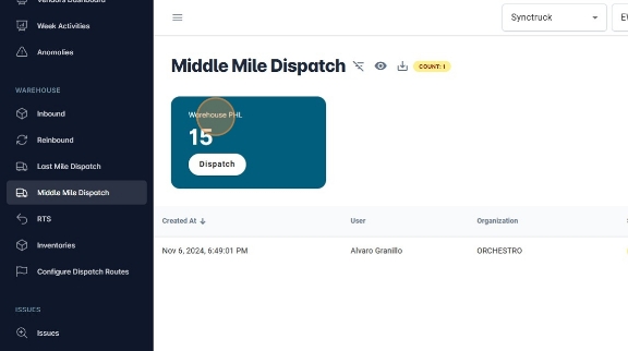 - Navigate to https://platform.syncfreight.com/#/warehouse/mm-dispatches Click "Middle Mile Dispatch" in the left sidebar.