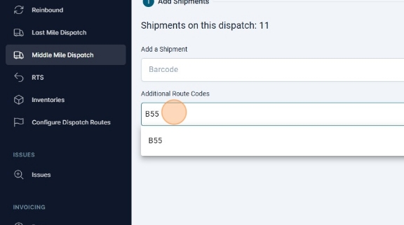 - If you want to add a shipment that does not belong to a route code served by the middle mile station, you can add the route code manually in the