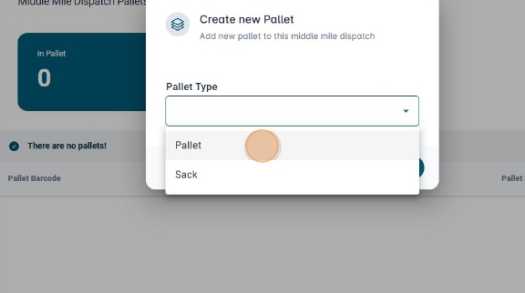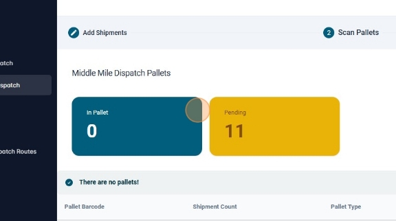Middle Mile Dispatch Palletsphase. Here you can create the pallets that the shipments will be assigned to. Also, you can see the number of shipments that are already assigned to a pallet and the amount of pending shipments.