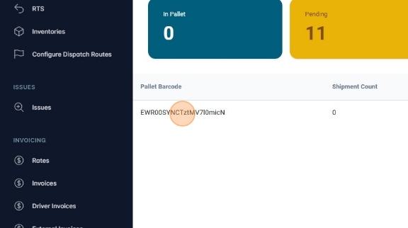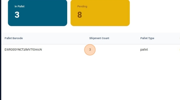 - A new pallet will appear on the table. You can see the pallet barcode, which is generated automatically, the shipment count, which initially will be zero, the pallet type and the status.