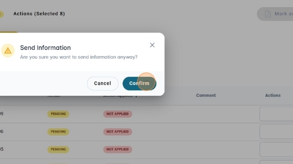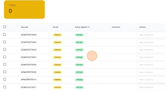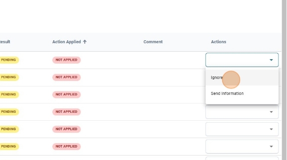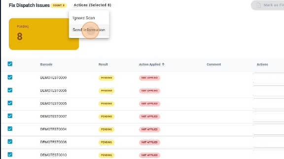 - The table with the pending shipments has a select input for each shipment that has an issue. The select input is for you to enter what is the action to solve the issue. In this case, you can select