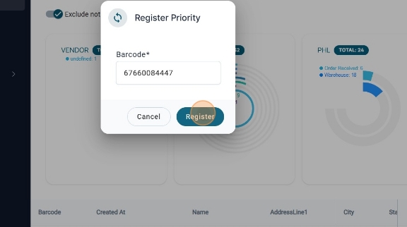 - A modal like this, will be shown, add the Barcode, and Click on "Register"